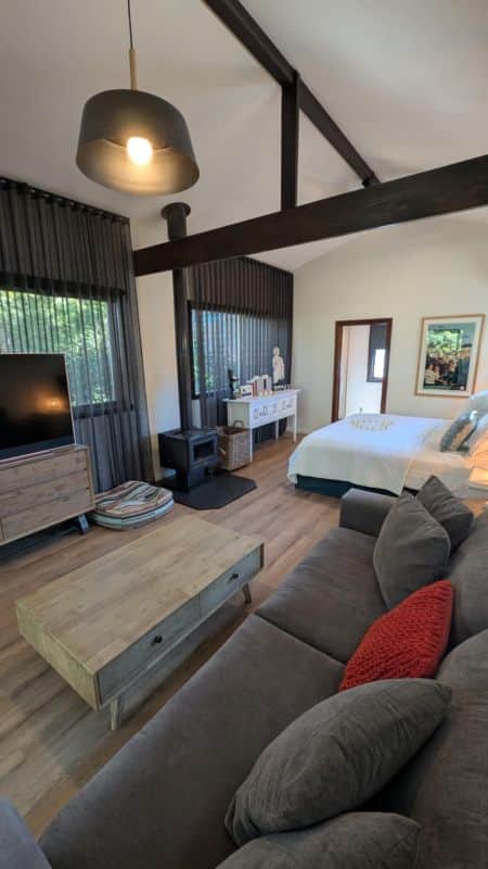 At the centre of the living area, a crackling wood fire sets the mood for quiet, cosy evenings — the perfect spot to curl up with a glass of wine or a good book. The spacious four-seater lounge invites you to stretch out and truly settle in, while the luxurious king-size bed ensures restful nights wrapped in comfort. Entertainment is covered too, with a Hubble TV providing access to all your favourite streaming services, so you can unwind with a movie or binge your current series.